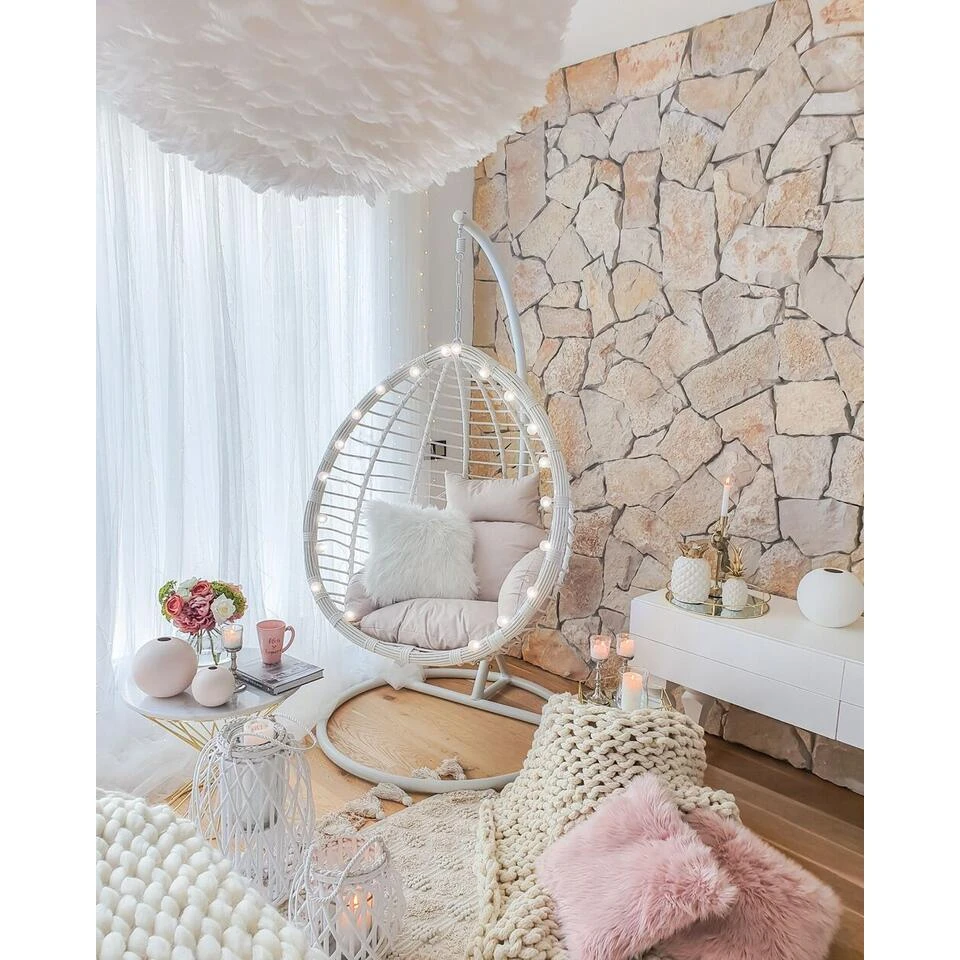 Moderne hangstoel met kussen. Gun jezelf een moment om te ontspannen met een boek op het heerlijk zachte zitkussen. De gevlochten stoel is opgehangen aan een zware metalen ketting, die op zijn beurt is bevestigd aan een zeer stabiel stalen frame. De stoel zorgt voor rustgevende, subtiele schommelingen waar je natuurlijk van kunt genieten.