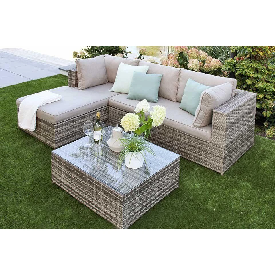 Deze mooie Spanje loungeset met chaise longue heeft een rustige uitstraling door het melange wicker. De kussens van deze loungeset hebben een effen taupe kleur en een prettig comfort.