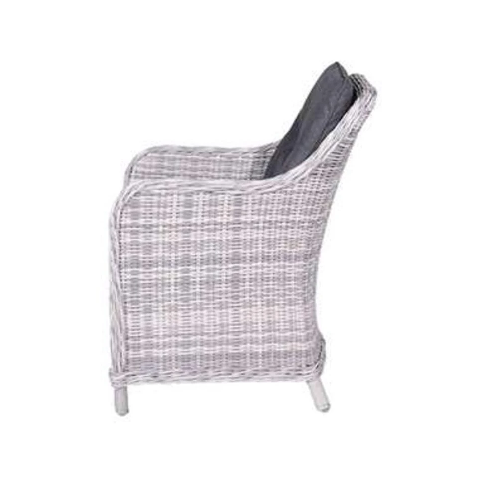 De mooie Nova tuinstoel uit de Nova serie kan gebruikt worden als losse tuinstoel, maar ook bij de Nova lounge dining serie is deze stoel een goede aanvulling. Deze tuinstoel is vervaardigd uit een onderhoudsvrij aluminium frame en weerbestendig half rond wicker kunststof vlechtwerkdraad in de kleur cloudy grey. Het draad heeft een dikte van maar liefst 5mm, wat zorgt voor een mooie robuuste uitstraling. Wicker is een stevig en duurzaam kunststof, waardoor je jarenlang kunt genieten van deze stoel. Het zit- en rugkussen is gemaakt van een hoogwaardige kwaliteit polyester. Het zitkussen is voorzien van een rits, waardoor het hoesje gemakkelijk met de hand gewassen kan worden. De rugkussens zijn voorzien van extra stiksels waarmee de stof op twee plekken naar elkaar wordt getrokken, wat zorgt voor een klassieke uitstraling. Deze stijlvolle look is geïnspireerd op de bekende klassieke chesterfield banken. Na gebruik kunnen de kussens opgeborgen worden in de schuur of een mooie kussenbox. Uiteraard kan de Nova dining stoel los worden gekocht. Met bijvoorbeeld een bijzettafeltje in hetzelfde kleur vlechtwerk draad creëer je een gezellig plekje. De Nova stoel combineer je gemakkelijk met andere meubels uit de Nova serie, zoals: een driezits bank, lounge dining tafels of met een mooie ruime hoekbank opstelling. En natuurlijk zijn al deze artikelen leverbaar in diverse kleurstellingen. De afmetingen van deze stoel zijn: B 58 x D 70 x H 85 cm.