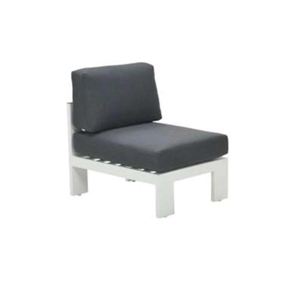 Wil je graag de Plaza loungeset uitbreiden? Bekijk dan eens het midden element van de Plaza serie. Het midden element is volledig gemaakt van aluminium met comfortabele lounge kussens. De rugleuning heeft een prachtige afwerking waardoor het lijkt alsof het van teakhout is gemaakt. Dit is gewoon aluminium met een teakhouten look. Het midden element is gemaakt van een onderhoudsvrij en weerbestendig aluminium frame met een stevige witte poedercoating. Deze laag zorgt ervoor dat het frame kras- en stootvast is. De rugleuning is voorzien van een teakhout look, maar is gewoon van aluminium. Dit geeft de loungeset een uniek uiterlijk. De meegeleverde kussens zijn gemaakt van hoogwaardig kwaliteit polyester. De kussens zijn voorzien van een rits waardoor de hoezen gemakkelijk met de hand kunnen worden gewassen. De kussens zijn niet waterbestendig en kunnen na gebruik worden opgeborgen in de schuur of kussenbox. Wel zijn de kussens voorzien van een waterafstotende coating. Dit is vooral erg praktisch als er bijvoorbeeld op het kussen wordt gemorst met drinken. Je veegt het vocht er namelijk gemakkelijk weer af. Het midden element wordt volledig gemonteerd geleverd, maar dient nog uitgepakt te worden. Het element wordt goed verpakt geleverd zodat er geen beschadigingen tijdens transport op komen. Het echte genieten kan daarna beginnen! De Plaza serie heeft een groot assortiment en is volledig uit te breiden naar wens. De gehele Plaza serie van kwaliteitsmerk Garden Impressions bestaat uit; een 3-zits bank, hoek bank, midden element, poef, lounge tafel, lounge fauteuil en een lounge dining tafel. De Plaza serie is leverbaar met een witte of donker grijze coating. De afmeting van het middenelement is 67,5 x 85 x 65 cm.