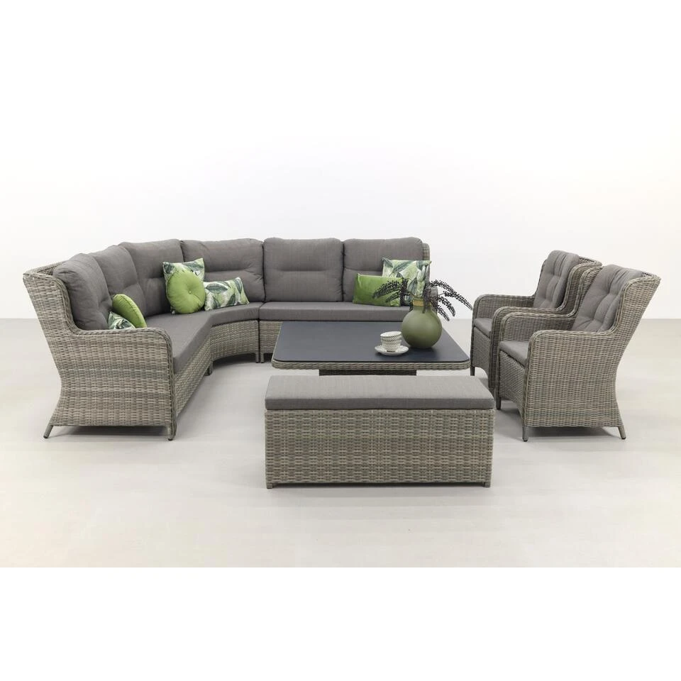De dining loungeset wordt geleverd inclusief comfortabele loungekussens maar exclusief decoratie.