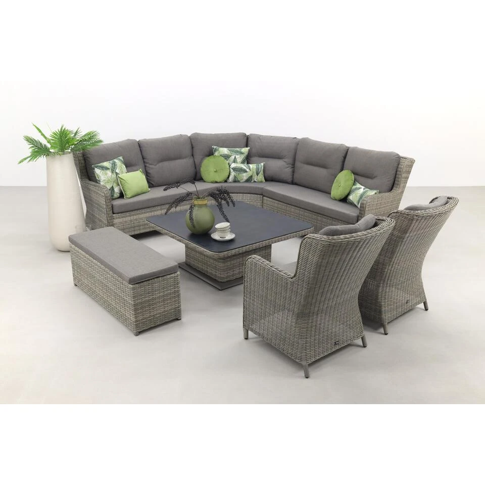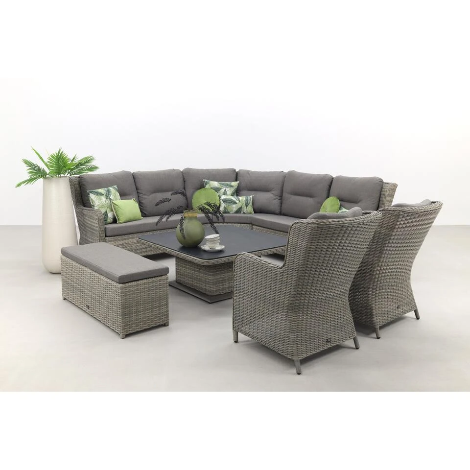 Het unieke van deze dining loungeset is dat de tafel in hoogte is te verstellen. Dit zorgt ervoor dat de tafel in de lage stand een normale koffietafel is en in de hoge stand en lounge diningtafel. Ook heeft de Sandigo lounge dining set een XL hoekmodule deze zorgt ervoor dat je in de hoekbank een extra zitplaats hebt. De twee stoelen en de bijzetbank maken de loungeset helemaal compleet.